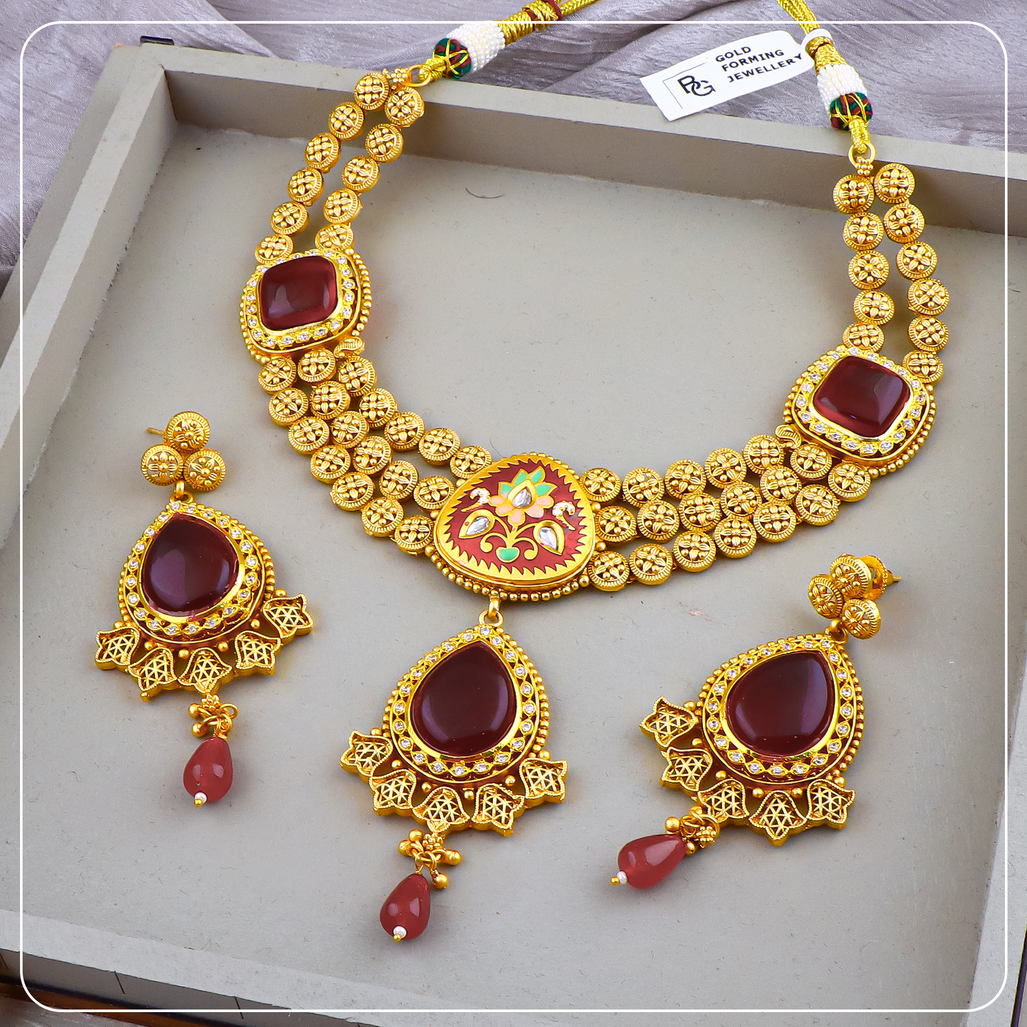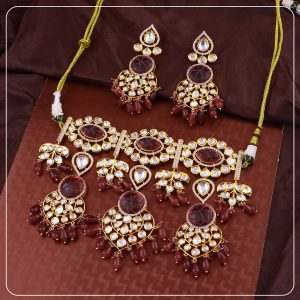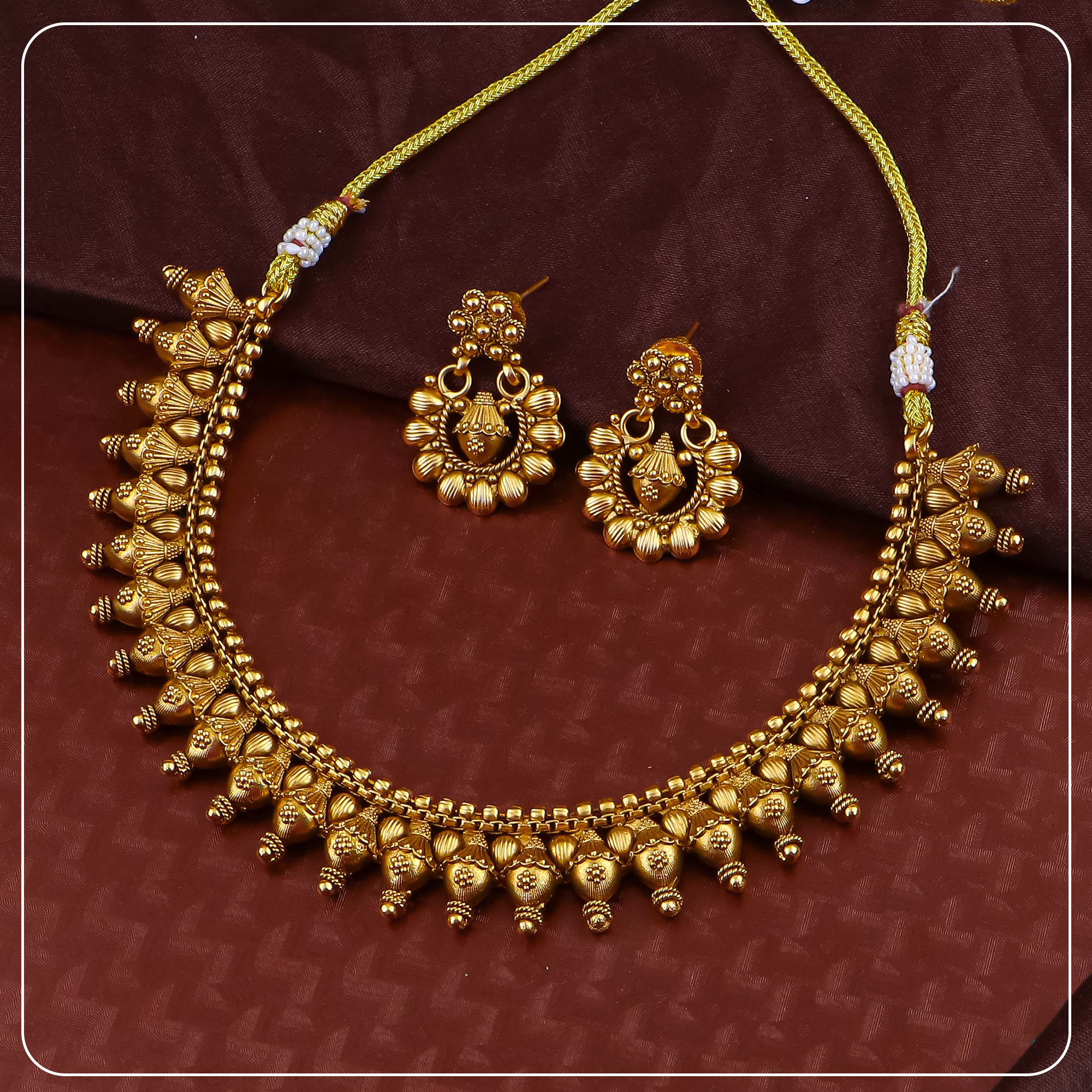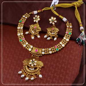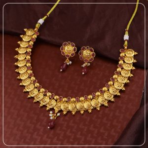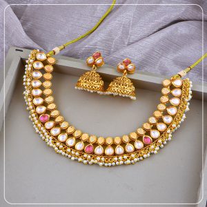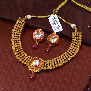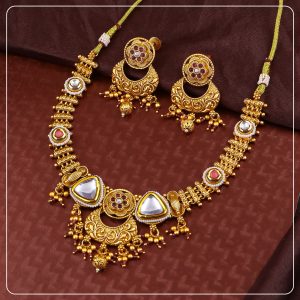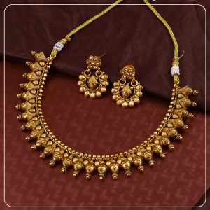 Made with premium gold forming and antique plating, this short necklace sits close to the neck, offering comfort without compromising on elegance. The detailed craftsmanship, matte finish, and matching earrings create a complete look ideal for bridal functions, traditional events, or statement gifting.