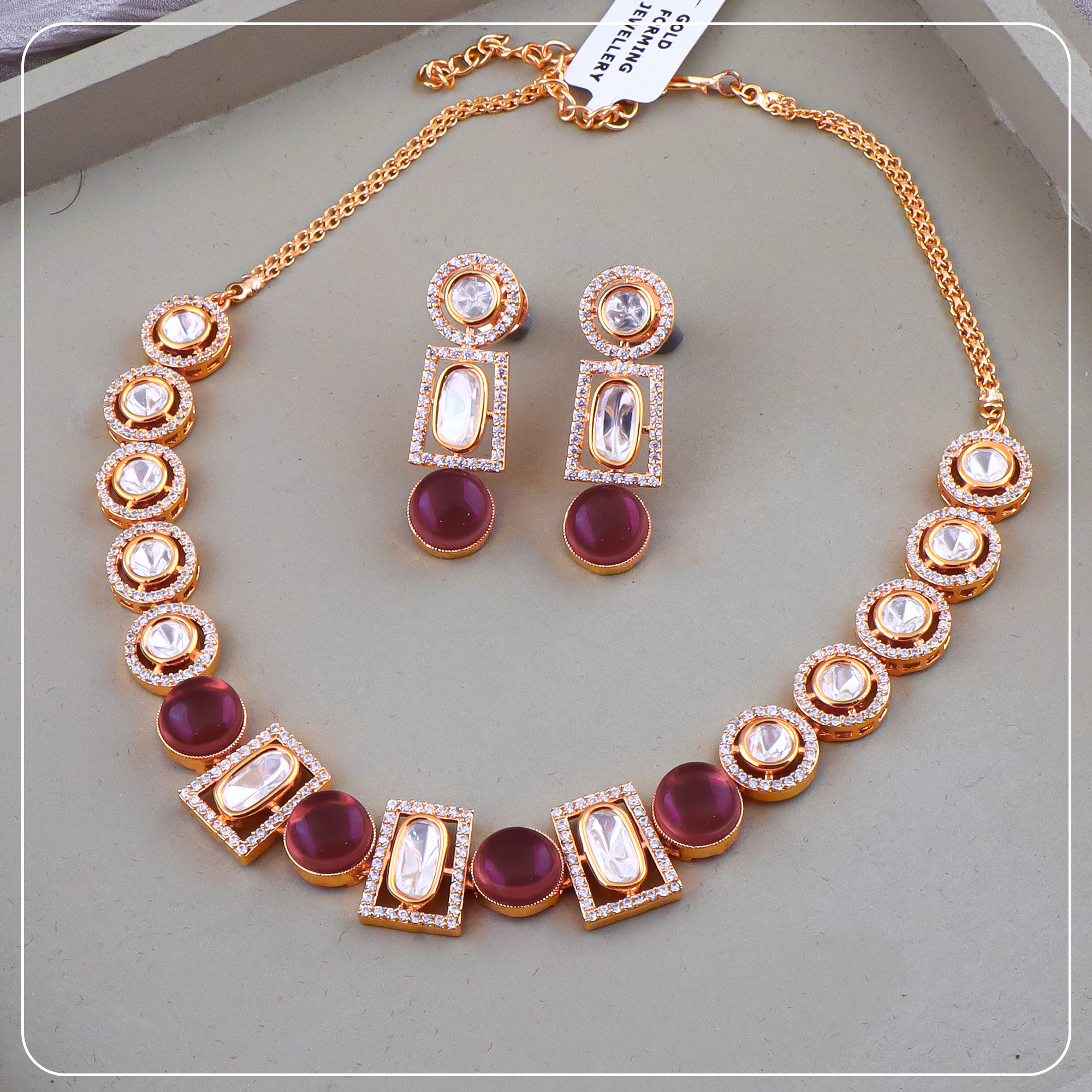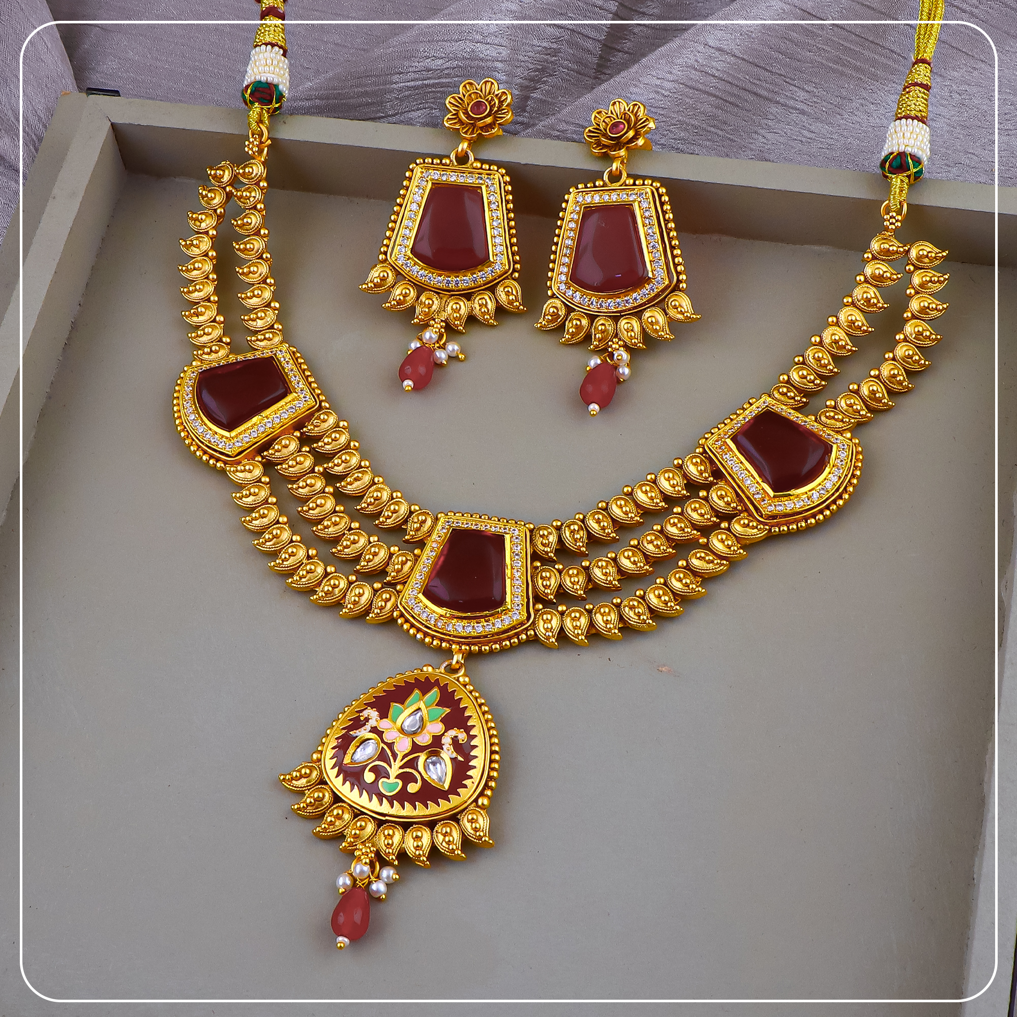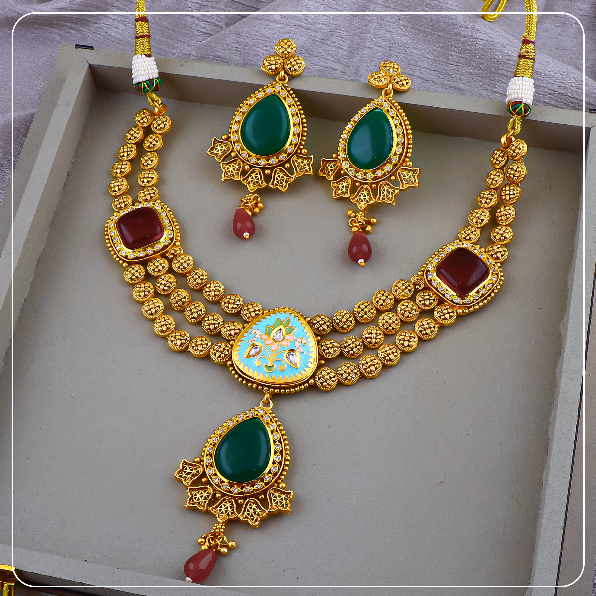 Made with premium gold forming and antique plating, this short necklace sits close to the neck, offering comfort without compromising on elegance. The detailed craftsmanship, matte finish, and matching earrings create a complete look ideal for bridal functions, traditional events, or statement gifting.