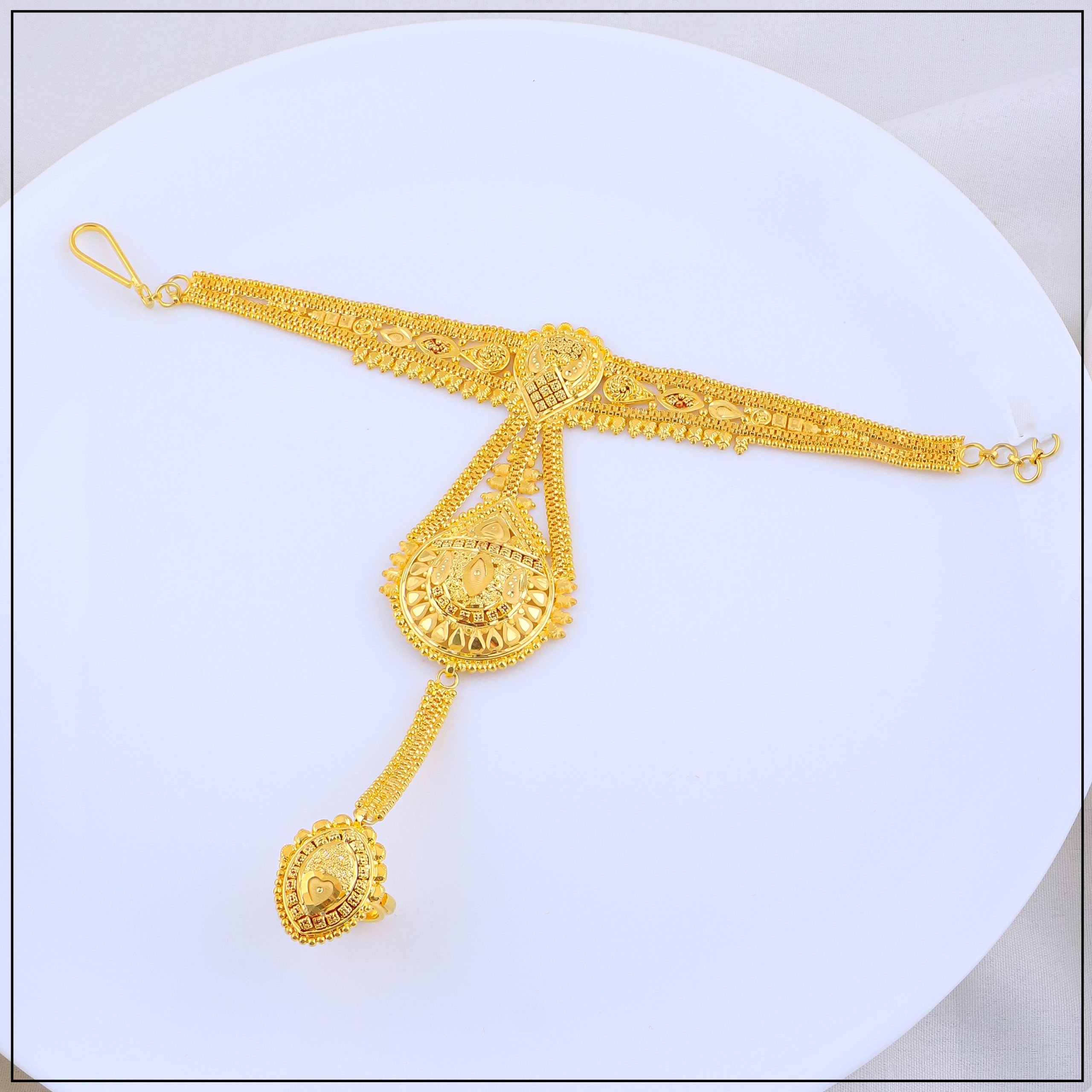 Expertly designed using gold forming techniques, our panja set gives the appearance of real gold while being lightweight, durable, and comfortable to wear. Intricate motifs, fine detailing, and flawless gold-like polish make it a perfect accessory for brides, dancers, or anyone wanting to make a statement with ethnic wear.